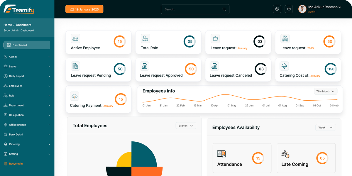 eTeamify helps you track leaves, submit reports, manage meals, and monitor projects with your own company subdomain.